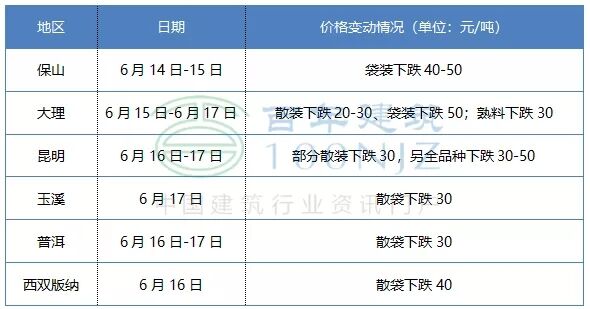 17日云南玉溪、大理地區(qū)部分品牌水泥價(jià)格下跌30元/噸,雨水天氣市場(chǎng)需求不佳,價(jià)格回落。