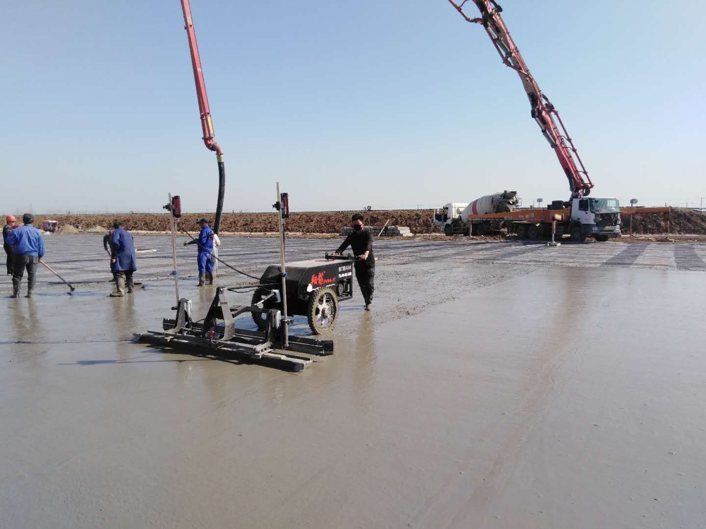 在大面積地坪施工中,傳統(tǒng)工藝的人工施工,班組人數(shù)由15名左右組成,單班完成工作量在700㎡左右。