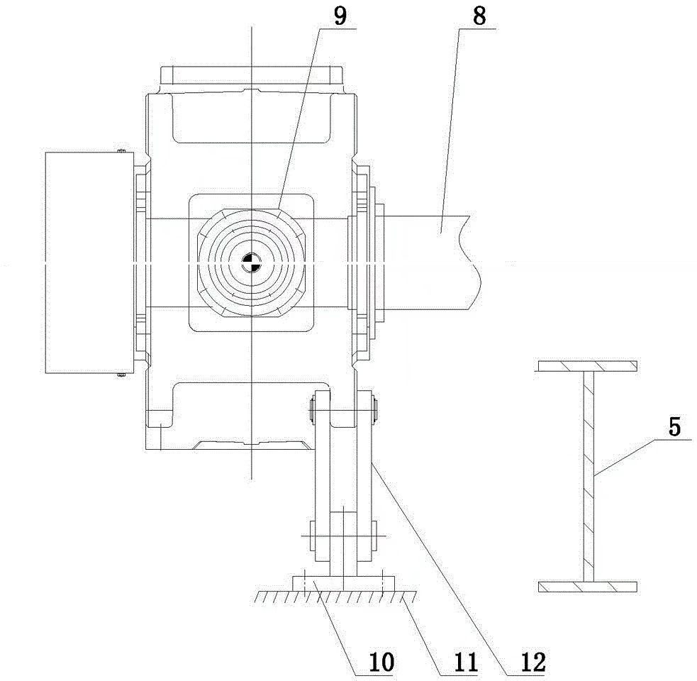 現(xiàn)有的重型板式給料機驅(qū)動機構(gòu)結(jié)構(gòu)如圖2所示,包括驅(qū)動機構(gòu)9,驅(qū)動機構(gòu)9下端設置扭力臂12,扭力臂12下端設置有連接座10,連接座10與地基11相連;其驅(qū)動機構(gòu)9與重板主體5之間不相連。由于重型板式給料機工況惡劣、振動較大,驅(qū)動機構(gòu)9單獨與地基11相連,造成驅(qū)動機構(gòu)9的震動與主機的震動不同步,因此,這種不同步的震動對鏈輪軸8傷害較大,嚴重時可導致鏈輪軸8斷裂。