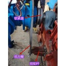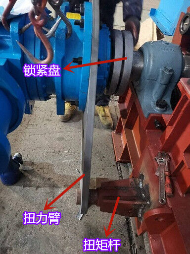 驅(qū)動機構(gòu)由電機、減速機、鎖緊盤和扭力裝置組成,驅(qū)動機構(gòu)通過鎖緊盤帶動鏈輪軸旋轉(zhuǎn),從而對物料進行輸送。為了抵抗驅(qū)動機構(gòu)隨鏈輪軸旋轉(zhuǎn)的力,扭力裝置需要固定在地基上或者機架上。