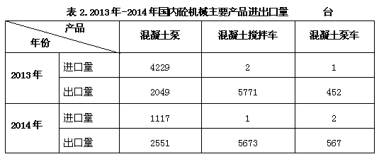 截止到2014年底,中國工程機(jī)械主要產(chǎn)品保有量約為650萬-704萬臺。其中,混凝土攪拌運(yùn)輸車29.2萬-31.6萬臺,混凝土泵車5.9-6.3萬臺,混凝土泵6.3萬-6.8萬臺,混凝土攪拌站4.7萬-5.2萬臺。